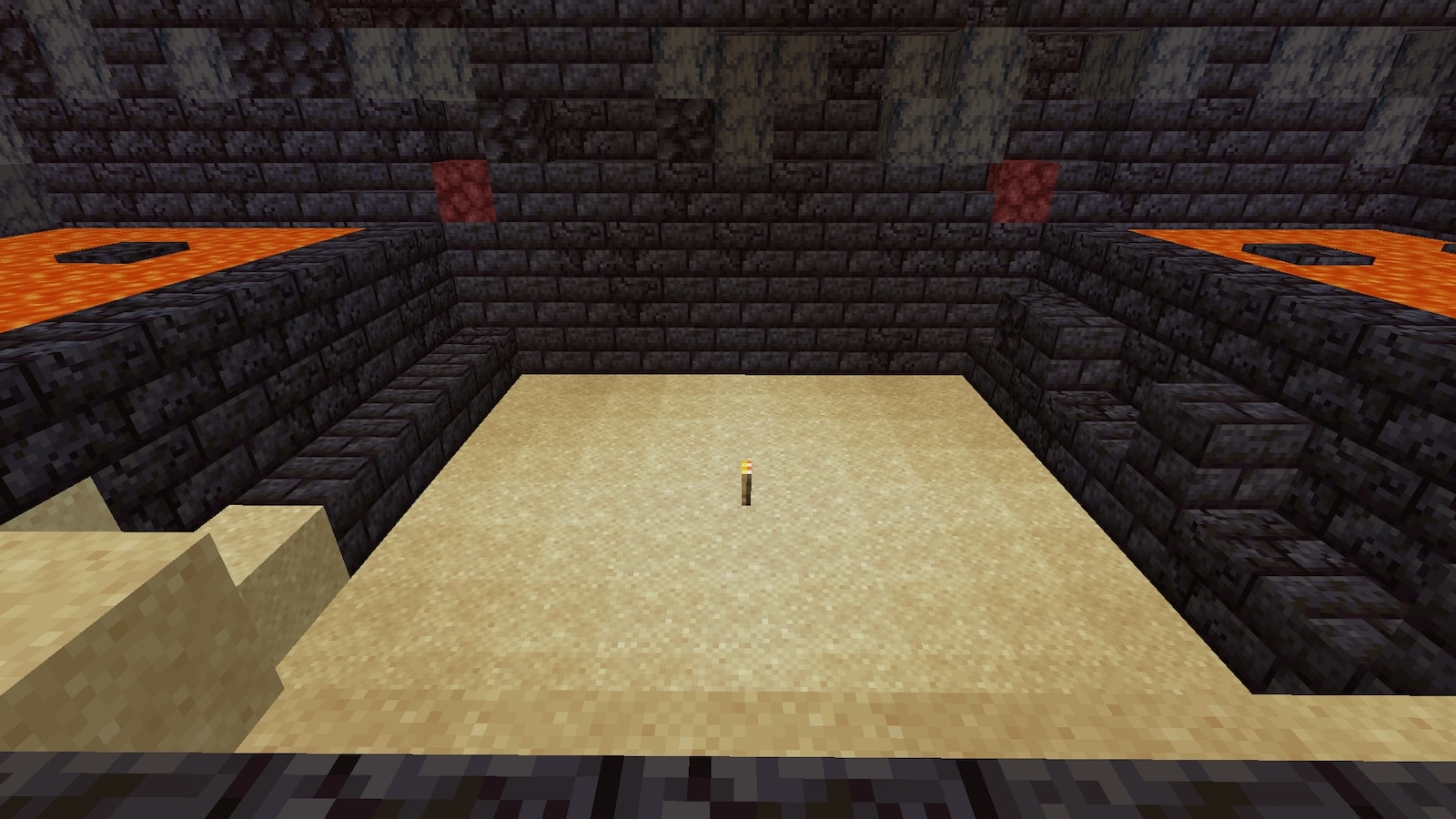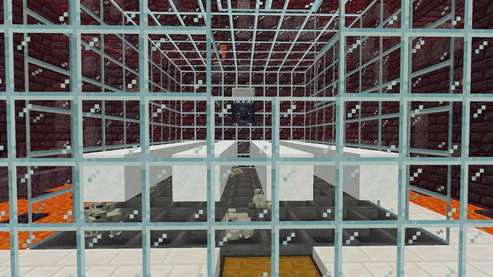 上の画像では、要塞の床の上(溶岩のひとつ上)にホッパーを敷き詰めています。こうするとスポナーとホッパーの間に3ブロックの空間ができます(スポナーの高さは要塞によって違うらしいので3ブロックになるとは限らない)。ちなみにホッパーは手前のチェストにアイテムが流れる方向に設置しています。