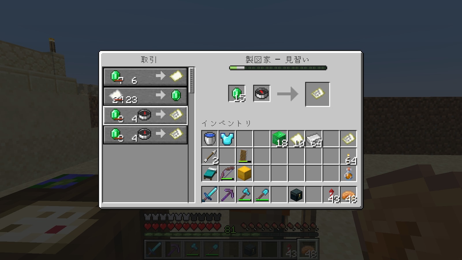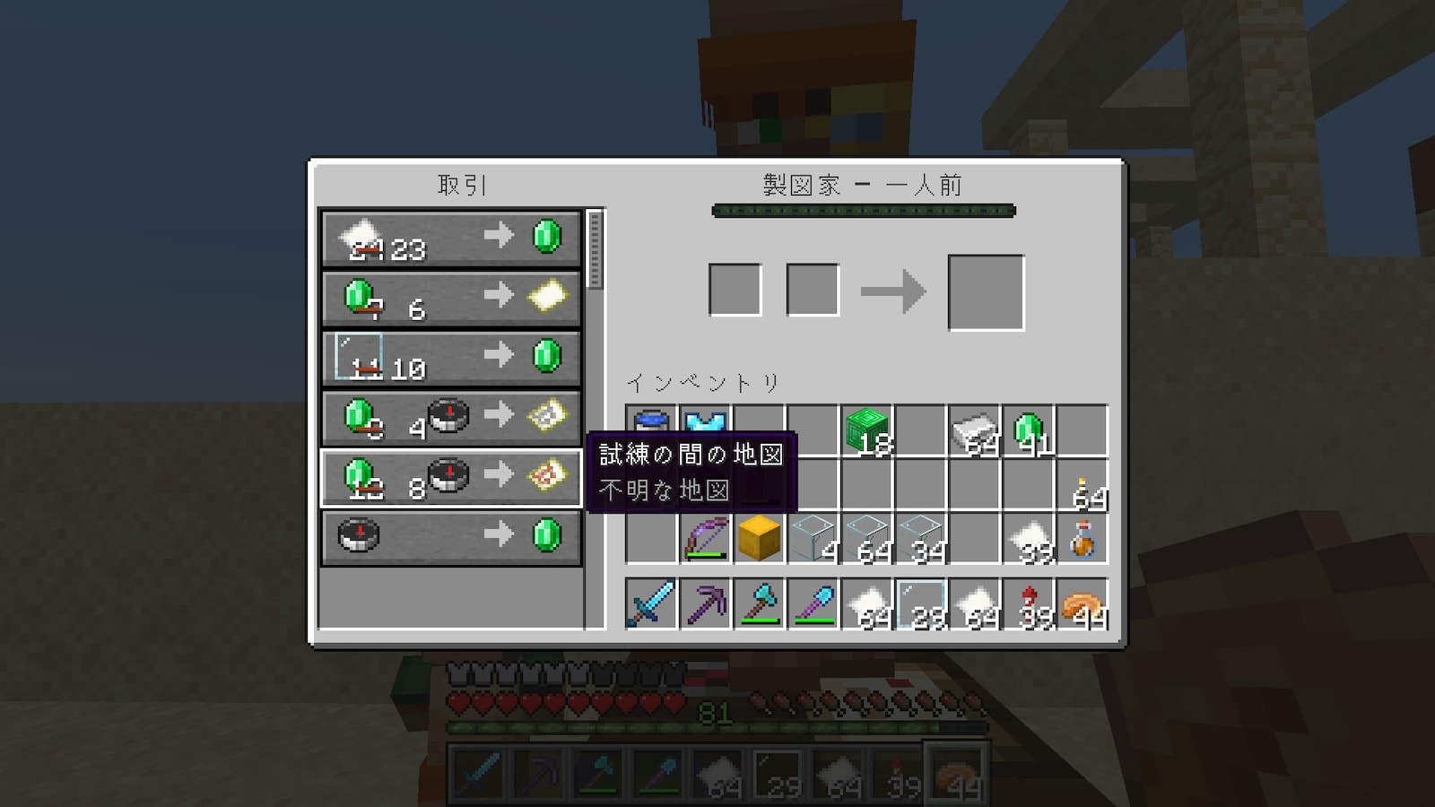 村人との交易で地図がもらえるらしいので、司書ガチャをやった村でガチャってきます。