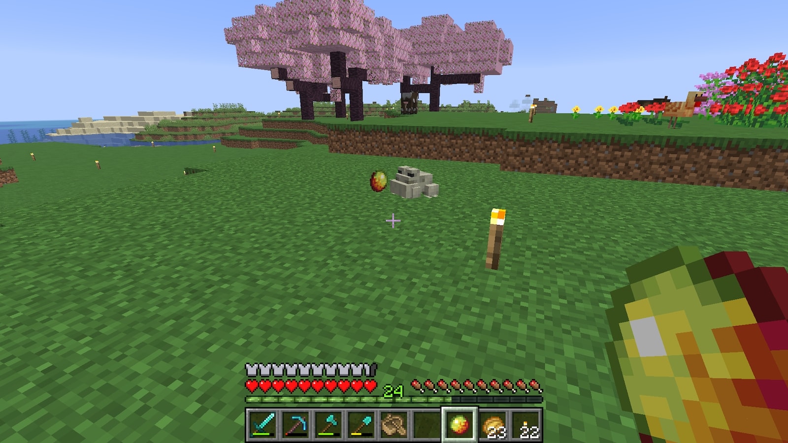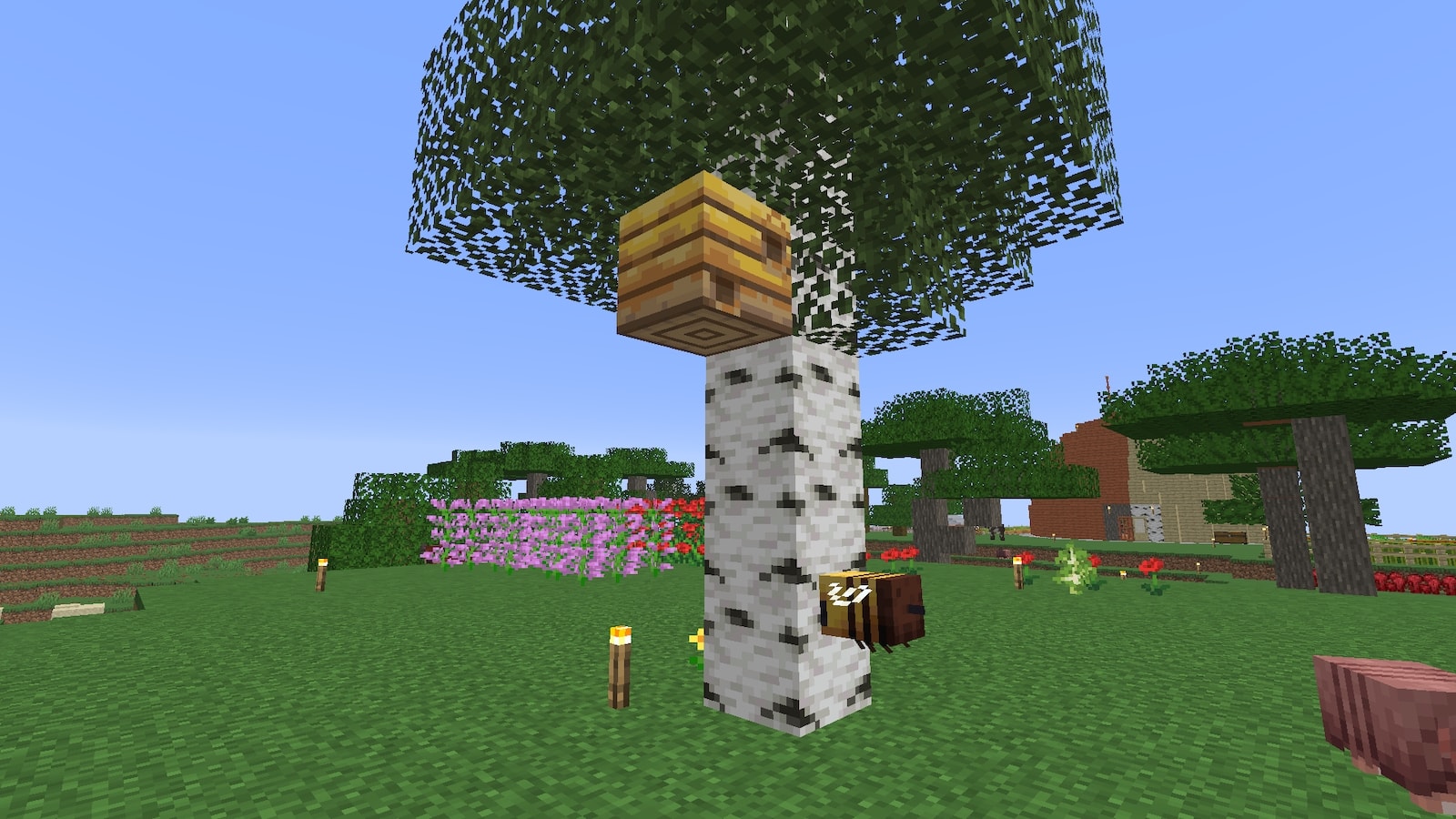 花の近くにオークかシラカバを植えると、稀に蜂の巣が生成されるという情報を目にしたのでやってみたらできました。