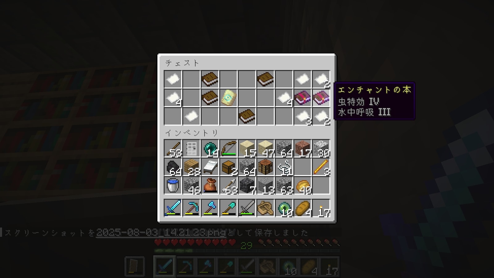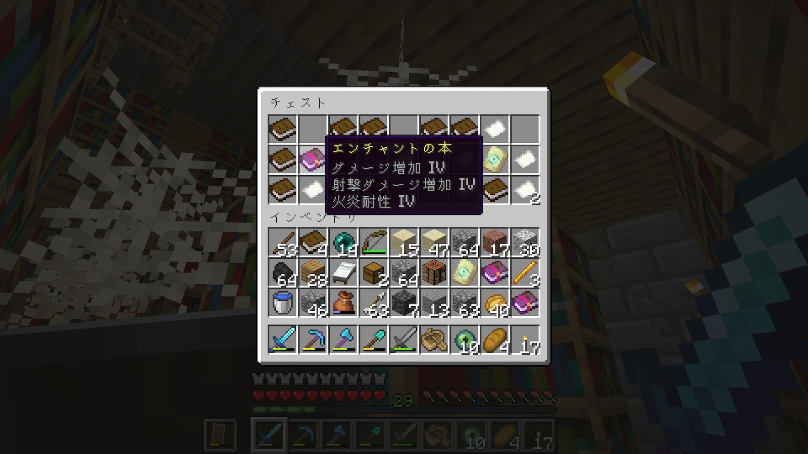 時間はかかりましたが、欲しいエンチャント本がすべて揃い、司書ガチャ終了しました。「ダメージ軽減4」が全然出なかった。