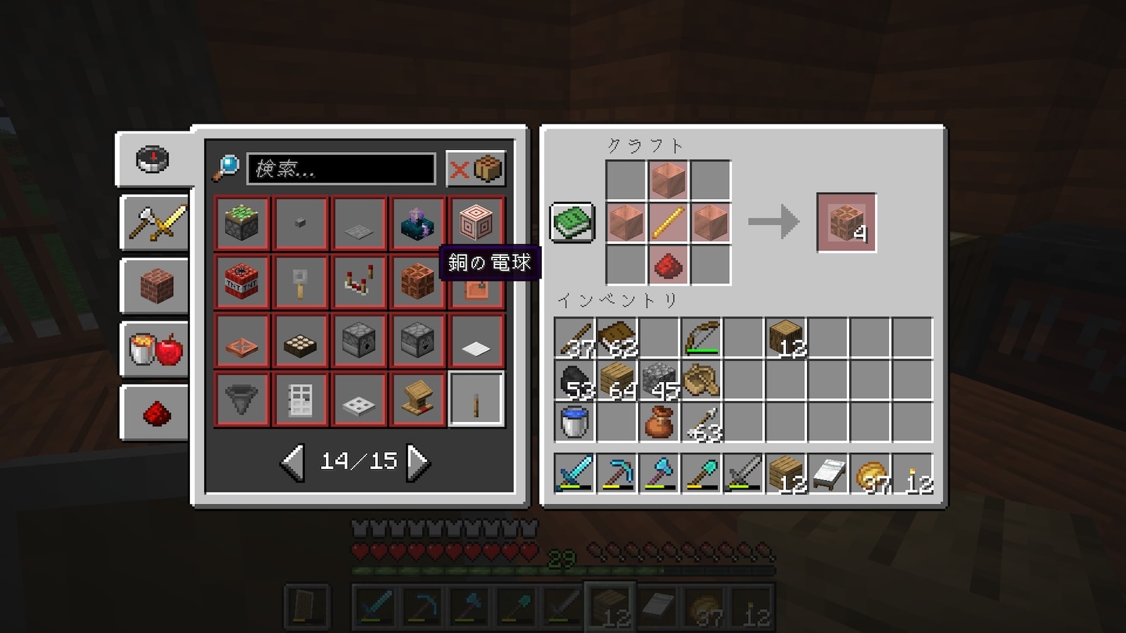 エンチャントテーブル周りの本棚を作ろうとしていたら「銅の電球」というものを発見。見た目が良いな。