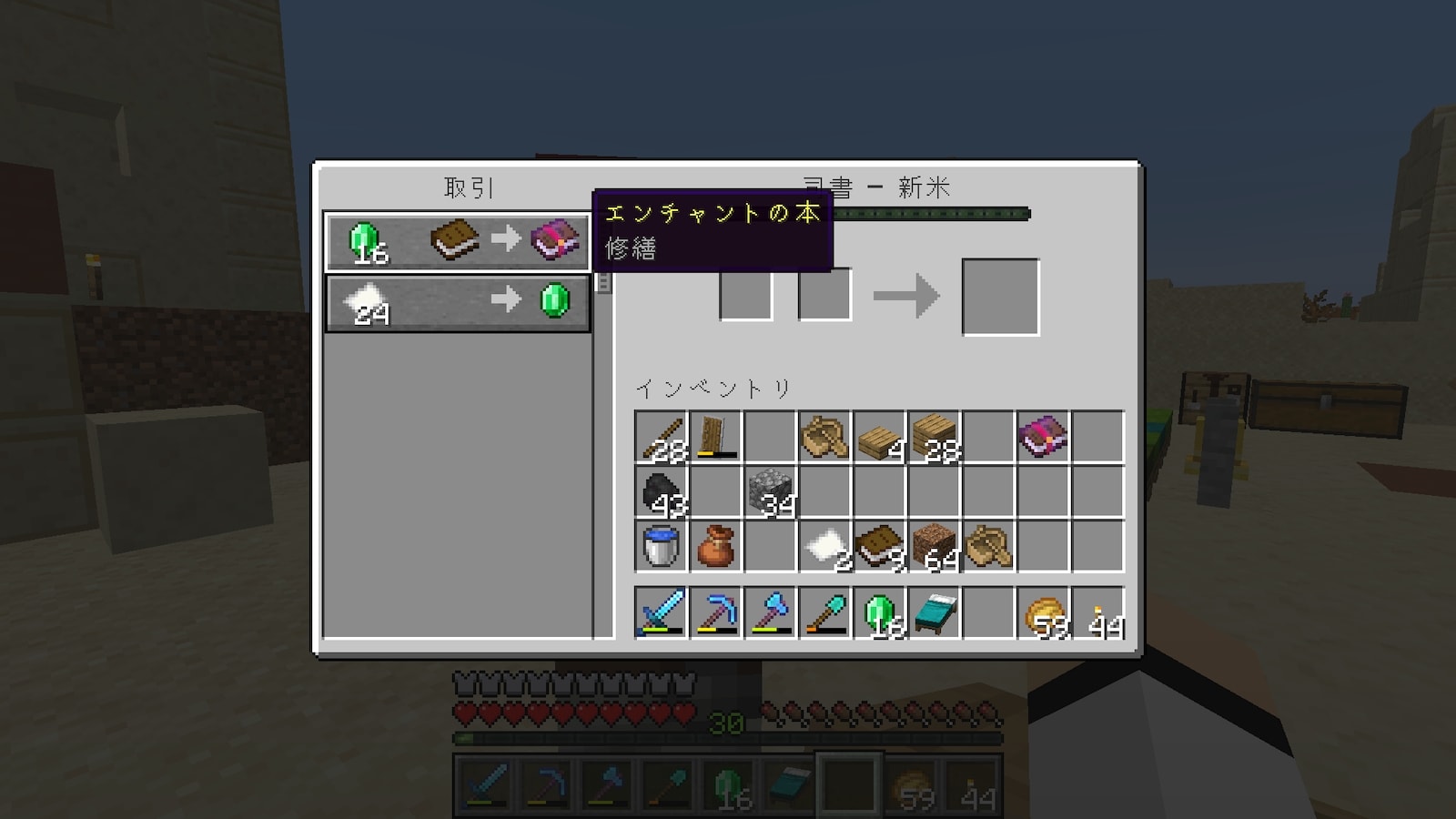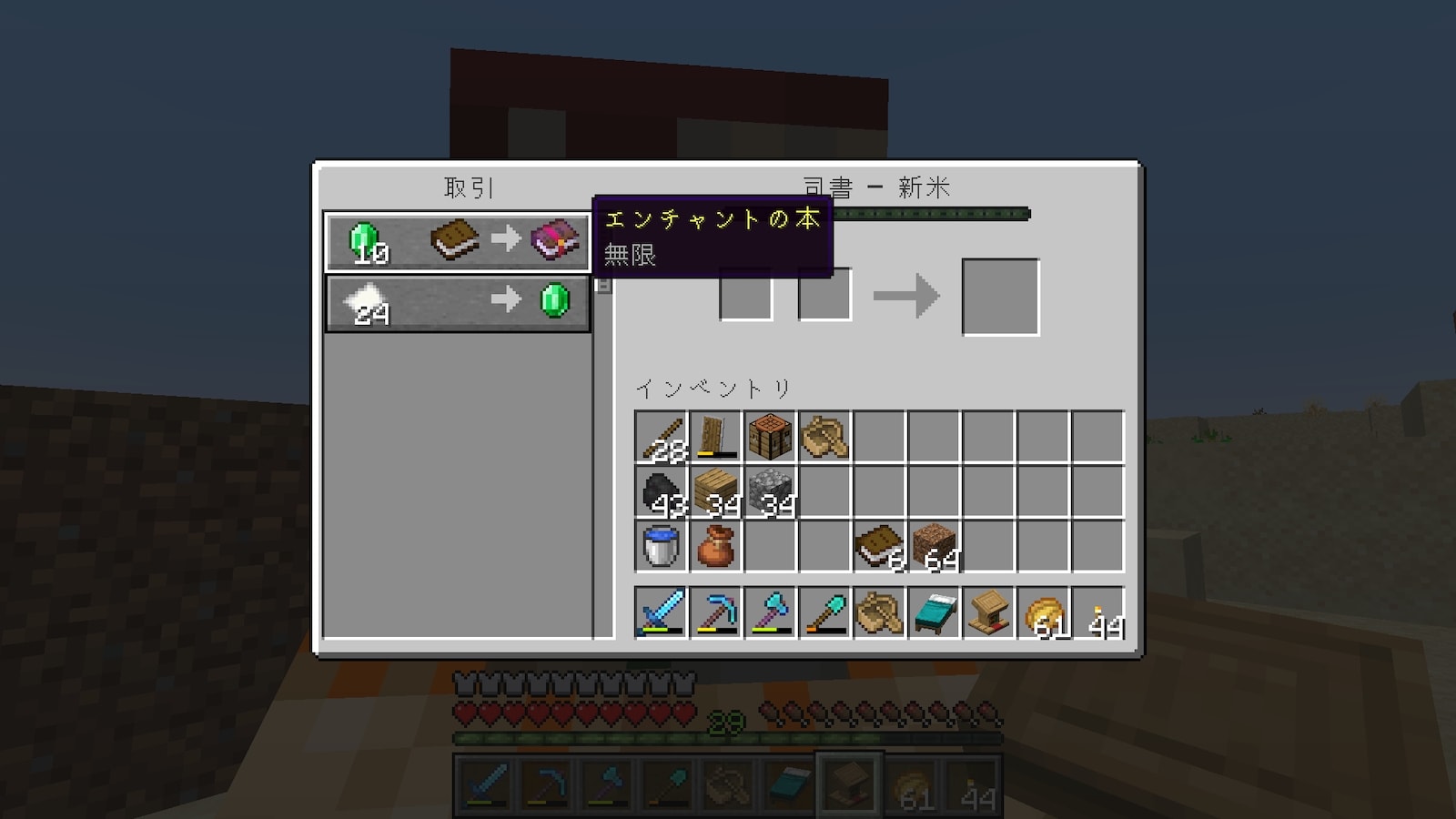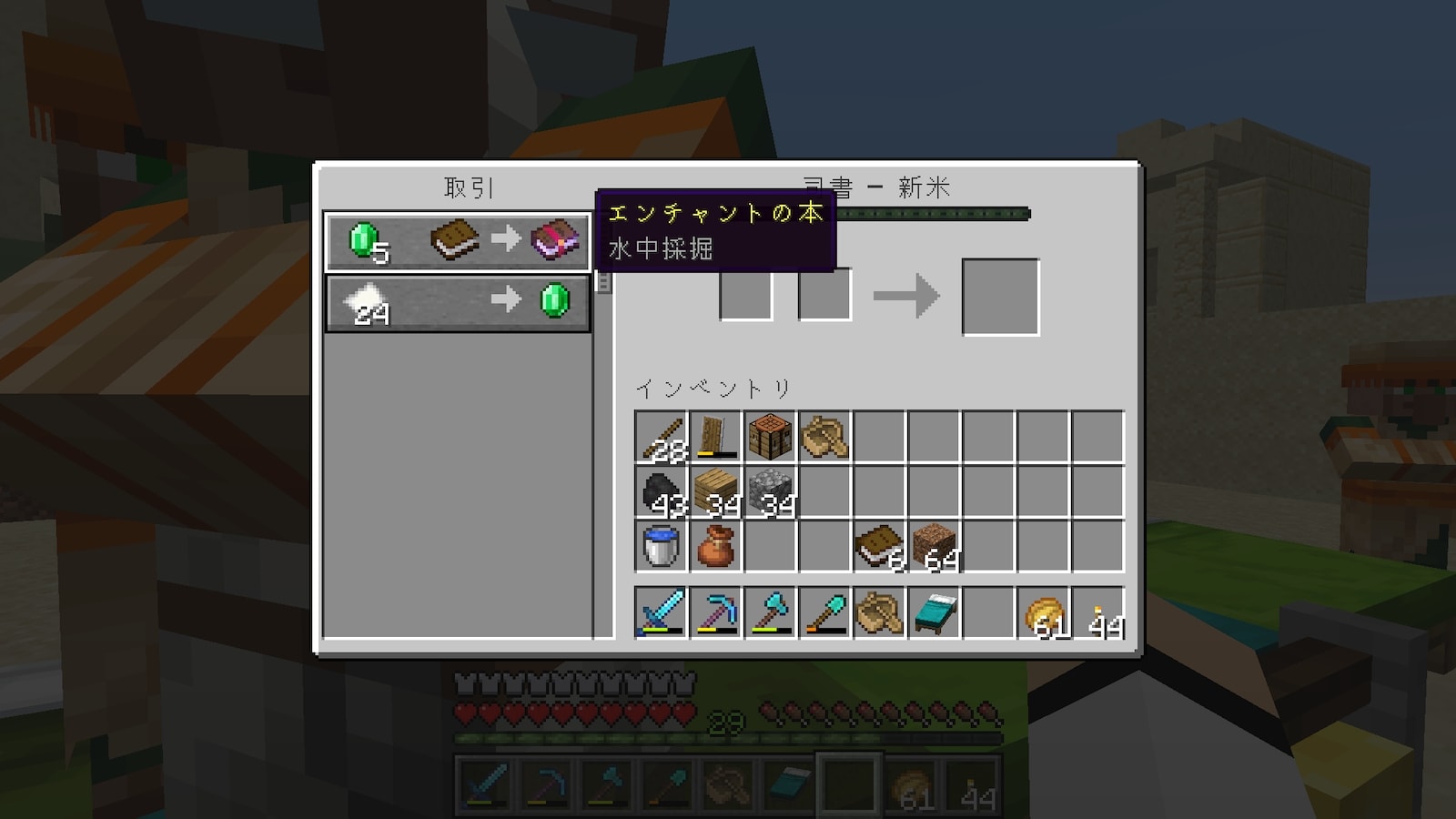 村人との交易はしない予定でしたが、マイクラを再開して数日で、司書からエンチャント本をもらわないと効率が悪すぎることに気付き始めていました。