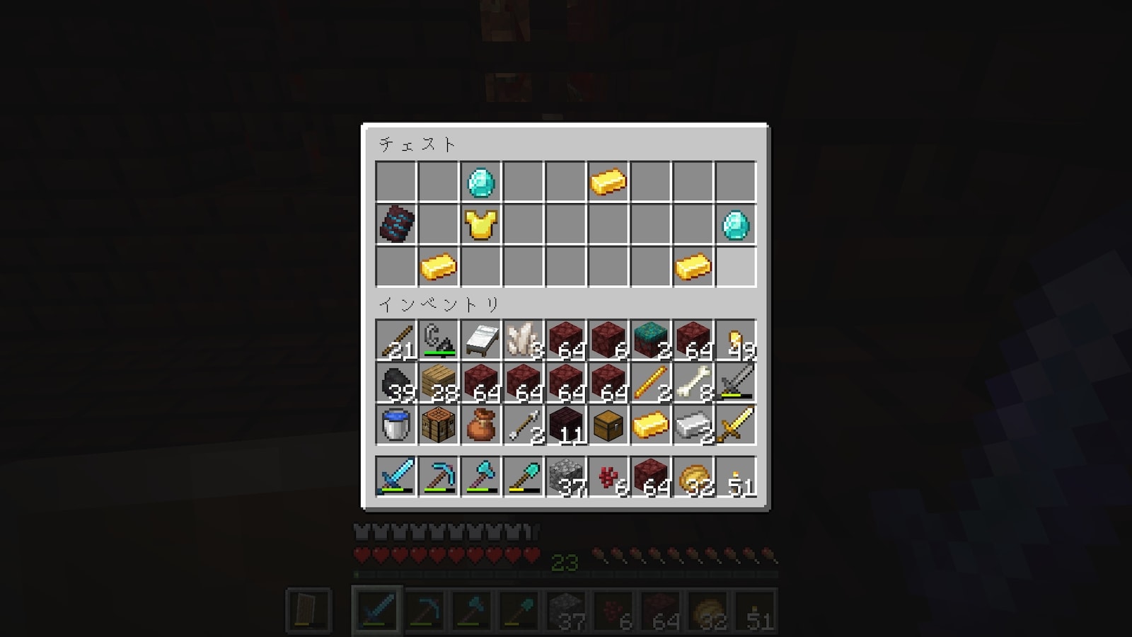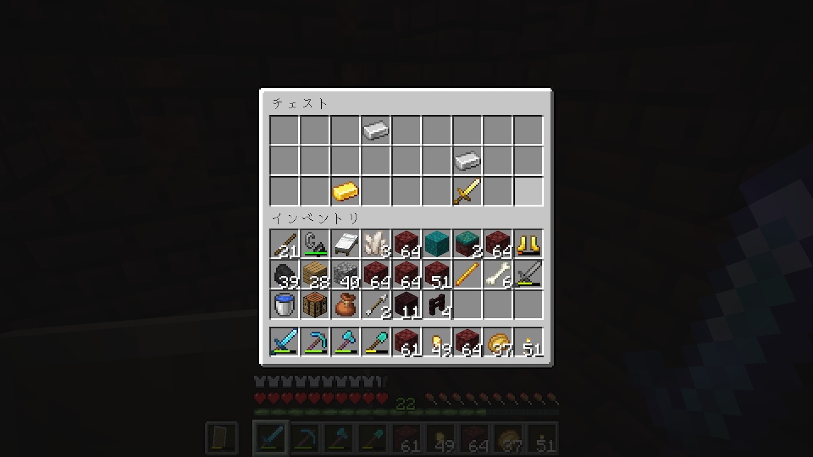 早速チェストを発見。微妙ですね。ネザー要塞のチェストはこんなもんですよね。