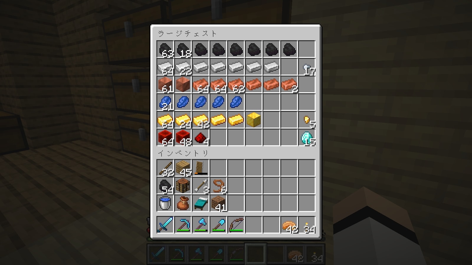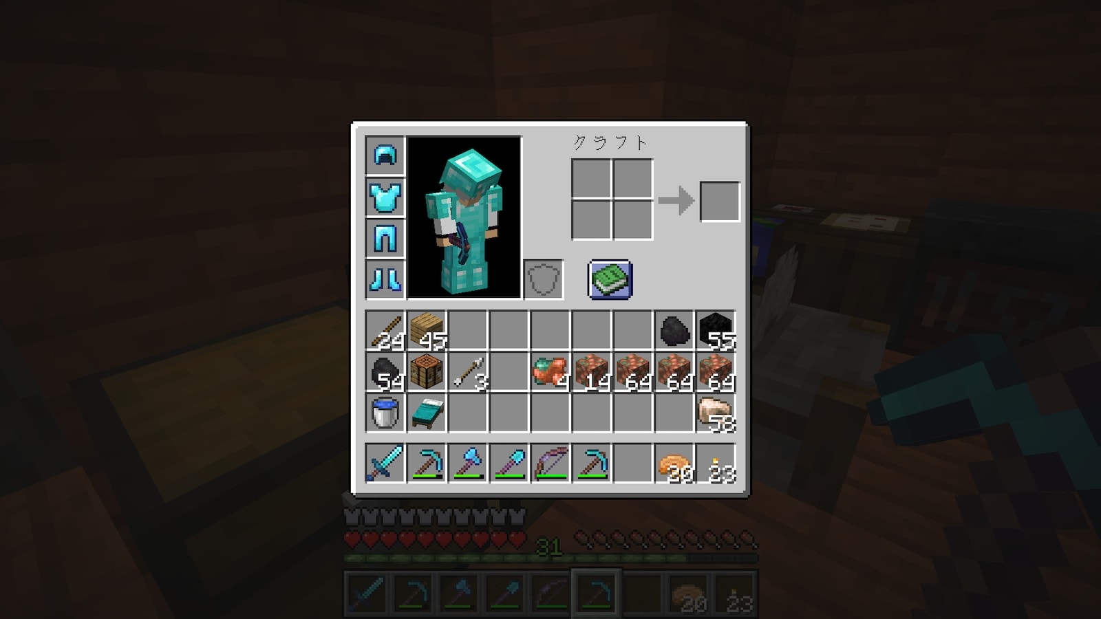 これまでは購入したエンチャント本を一箇所にまとめていましたが、今回は購入する店にチェストを置いてそこに保管することにしました。どっちが便利なんだろう。