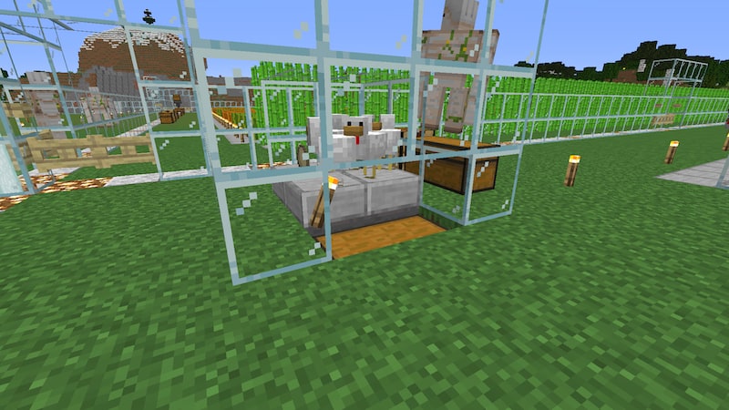 村人が住む区画には、卵自動回収装置があります。装置といっても、ニワトリの下にホッパーが置いてあるだけですけど…。