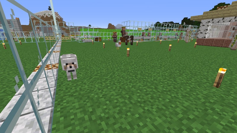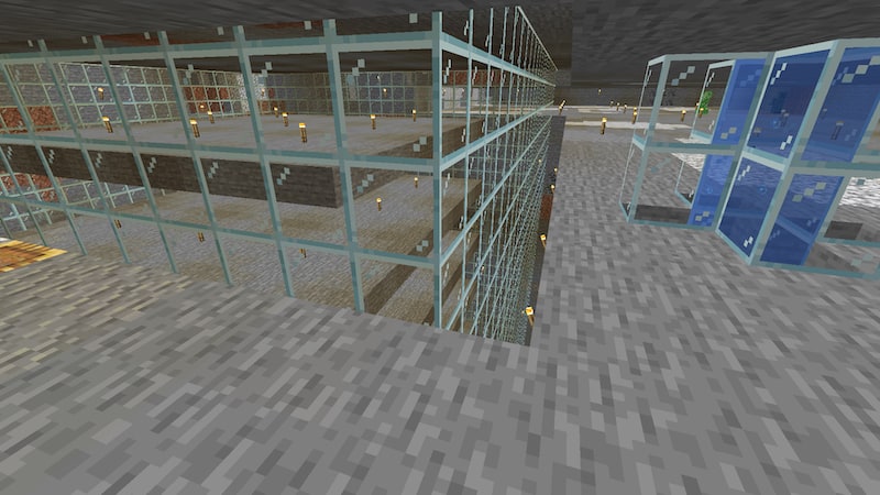 最近のマイブームは、100×100くらいをガラスで囲んで、それを4分割して、自宅、農場、村人の家、植林場にしています。とりあえず使えればいいという感じで、あまり綺麗にはできてないですね。湧き潰しも松明のままだし…。
