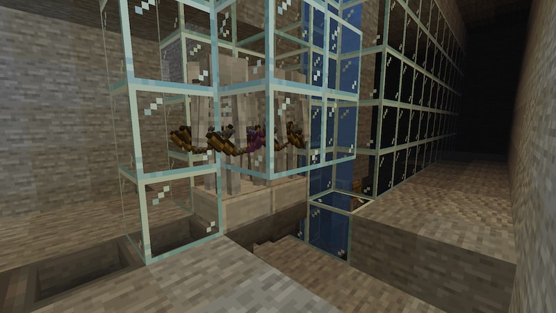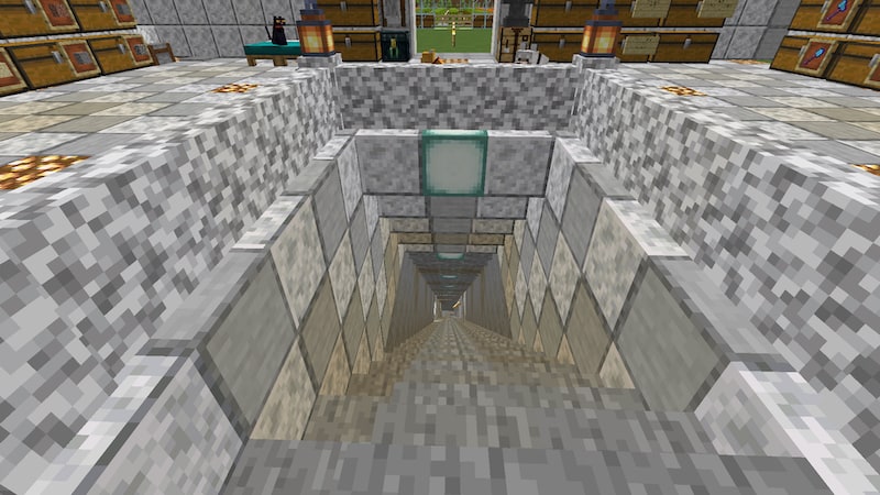 地下へは、自宅の中にある階段から降りられるようにしています。幅3ブロックの階段で、一番左にレールを敷いてトロッコで移動できるようにしたかったのだと思いますが、中途半端なままですw。
