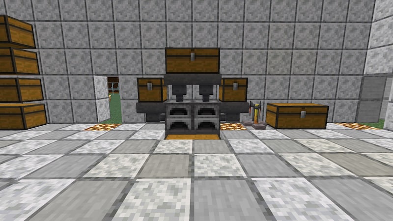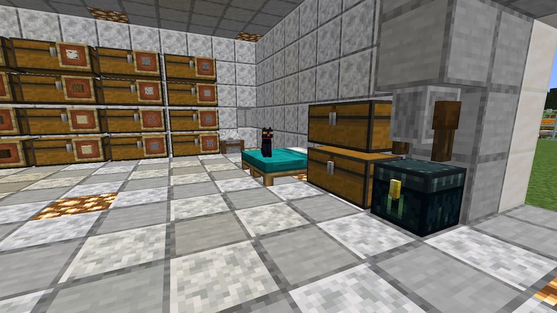 自宅、というか倉庫です。見た目よりも使いやすさ重視の設計です。とはいえ、豆腐拠点だと物足りない感じなので、角の部分に柱っぽいものをつけて、入り口はネザークォーツブロックで装飾しています。