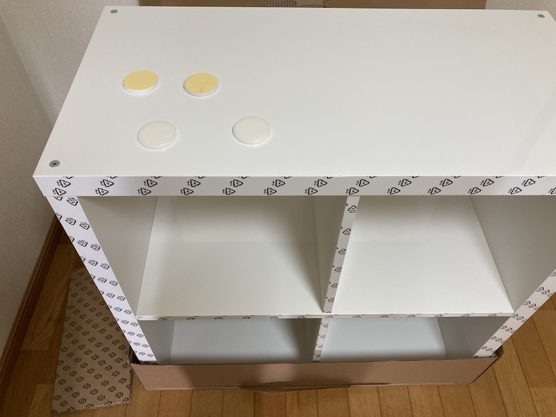 あとは足をつけて、側面のテープを剥がすだけです。ネジの頭が少し飛び出ているので、そのまま床に置くと傷だらけになります。
