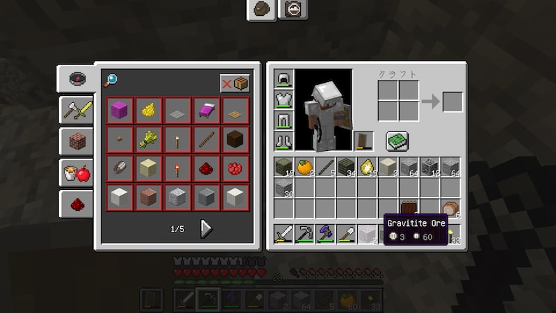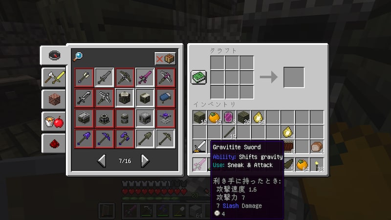 いろいろと攻撃していて気がつきましたが、普通の鉄の剣だと4回切ってやっと倒せる敵が、このグラビタイトの剣だと2回で倒せます。表示されている攻撃力は1しか違わないので、バニラの武器は弱化されるのかもしれません。モンスターの体力がやたら高いなぁと思っていましたが、たぶんこれが原因。グラビタイトの剣だとめちゃめちゃ楽に倒せる。