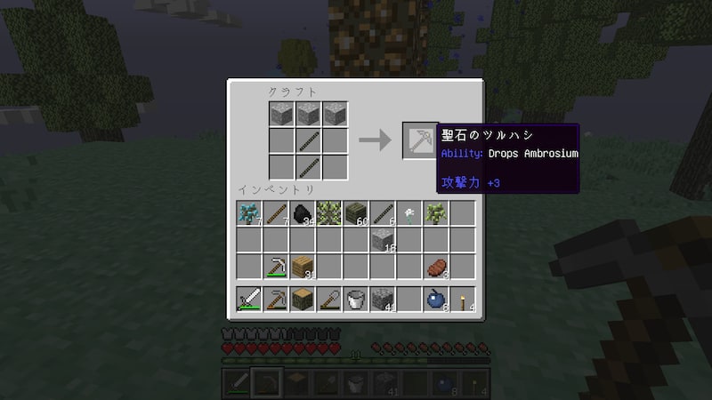 天界の石でツルハシが作れます。このバージョンでもたまにアンブロシアをドロップするようなので、このツルハシを使っていきます。