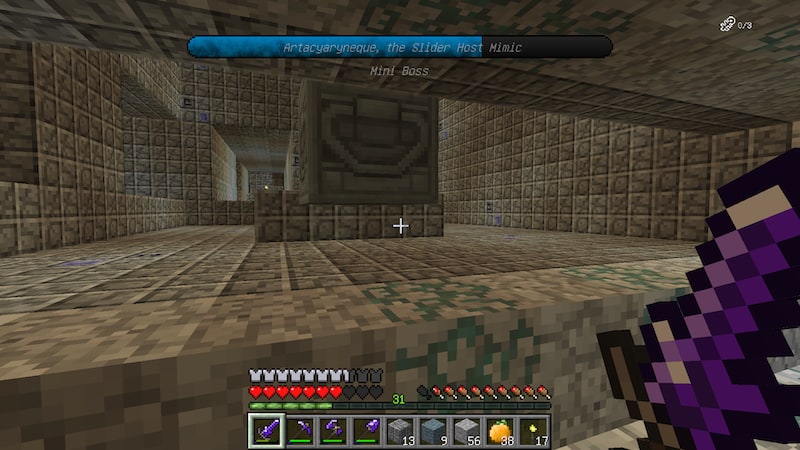 このダンジョンのスポナーで湧くモンスターは、スライムみたいなブロック状の敵が2種類と、ゴーレムみたいな敵2種類を確認しました。スライムは体当たりで攻撃してくるものと、近づいてきて自爆するもの、ゴーレムは爆発物を飛ばしてくるものと、吐き気を与えて接近して攻撃してくるものがいます。