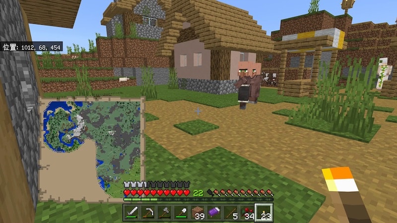 地図の端っこで村を発見しました。村人がなかなか見つからず、村人のいない村かと思いましたが、ちゃんといました。