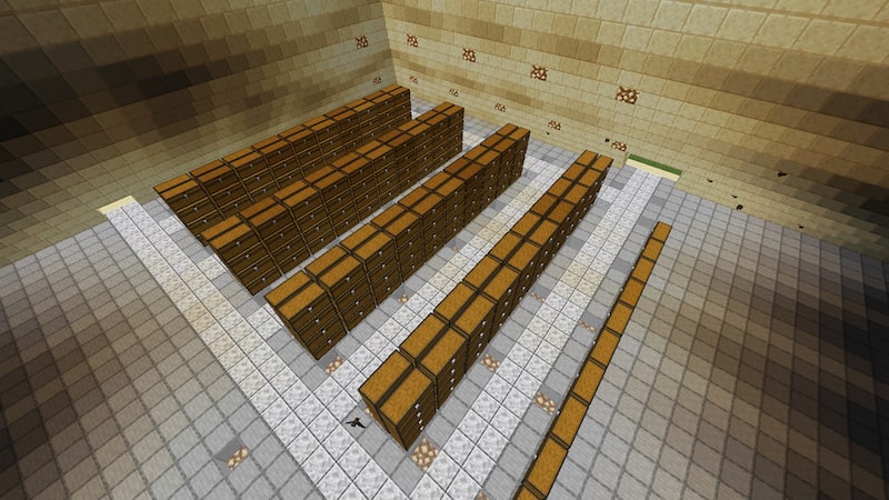 チェストはこんな感じで配置していきます。高さは4段で、チェストとチェストの間の通路は4マスとります。このスペースにこの置き方であれば、ラージチェストを1280個置くことができます。