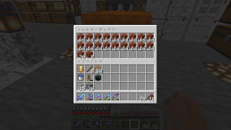 前回は、エンダードラゴンを倒し、最小?のエンドシティを発見し、その後普通のエンドシティ×2 からエリトラ×2 を回収しました。シュルカーの殻も40個くらい集まったので、一気にやる気が出てきました。