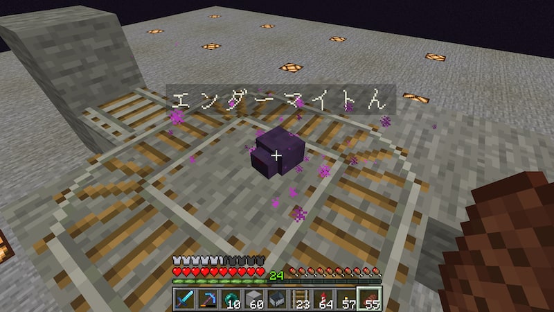 余談ですが、クリエイティブで作ったときに気がついたのですが、エンダーマイトのスポーンエッグでエンダーマイトを召喚しても、エンダーマンは襲わないようです。これを知らないで10分くらい悩んでいましたが、エンダーパールで召喚されたエンダーマイトは襲うようです。なんでだろ~。