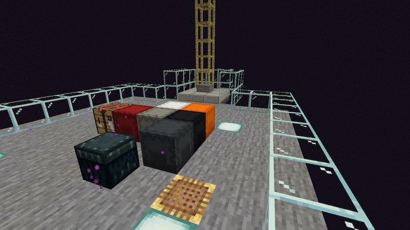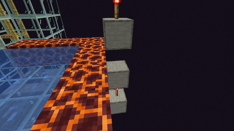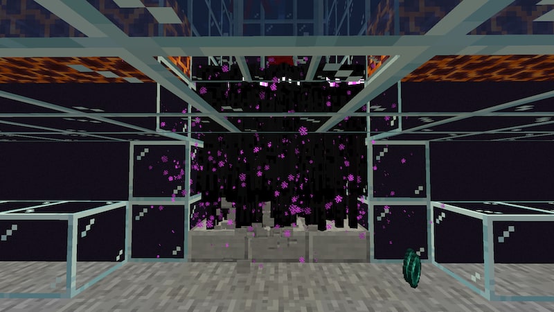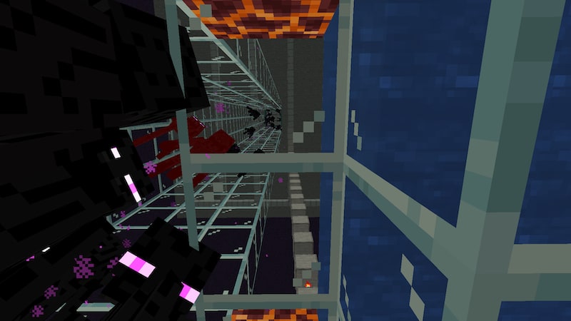 エンダーマンが落下するところはガラスでガイドを作り、待機所の天井は水で満たし、マグマブロックで水流が奈落に落ちないようにしています。