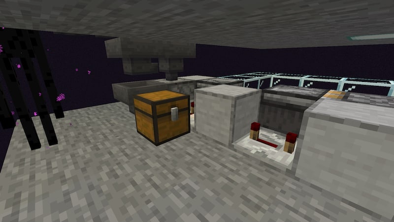 待機所の下に高さ2マスでほぼ同じ大きさのスペースを作ります。ここにドロップしたエンダーパールを回収し、余分なエンダーパールをドロッパーで捨てるシステムを作ります。詳細は上述した動画でご確認ください。これは動画のものを完全に再現しているわけではありませんが、構造は同じです。