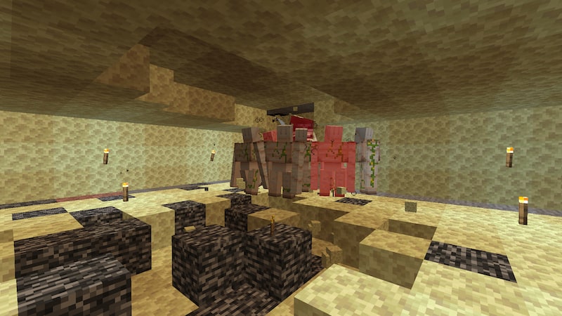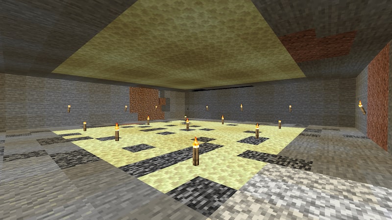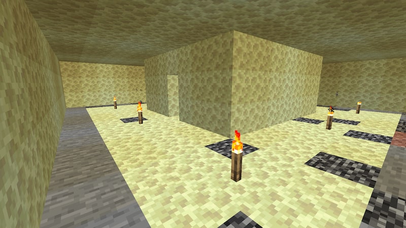 オーバーワールドです。岩盤が見える深さで 19×19×高さ4の空間を作り、13×13 の範囲の天井と床をエンドストーンに張り替えます。床の方は1段ではなく岩盤が出てくる深さまでエンドストーンを敷き詰めました。