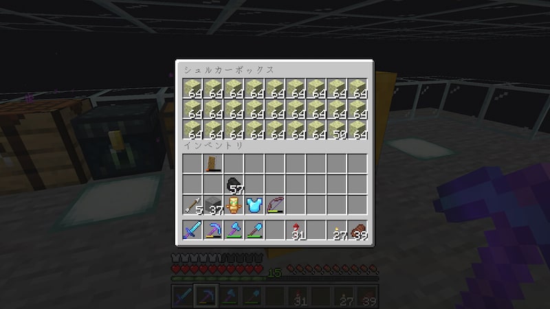 ウィザー戦用に拠点の地下を岩盤まで掘ってあるので、そこに爆発に強いエンドストーンを敷き詰めて戦いの場を作ります。黒曜石は回収が大変なのでエンドストーンを使います。