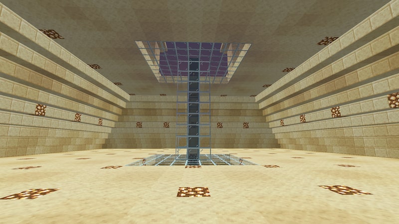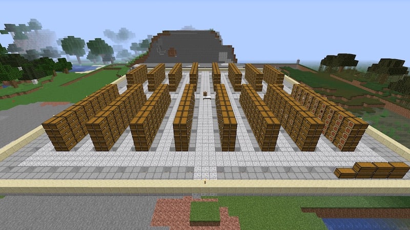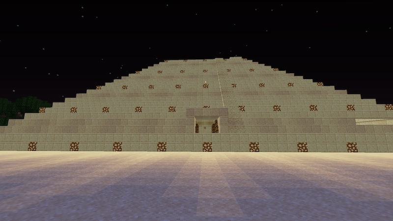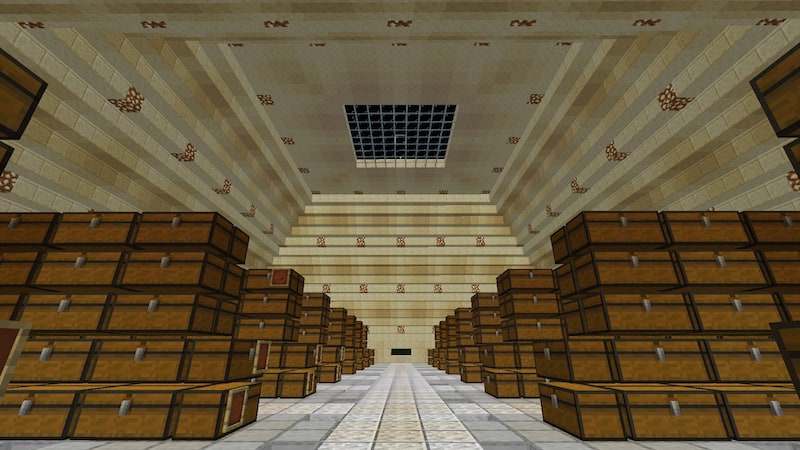倉庫はピラミッド風にして、雰囲気作りのために周りを砂地にしてみました。今はたぶん100×100だったと思いますが、今後の中でもっと広く砂漠化を進めていきたい。