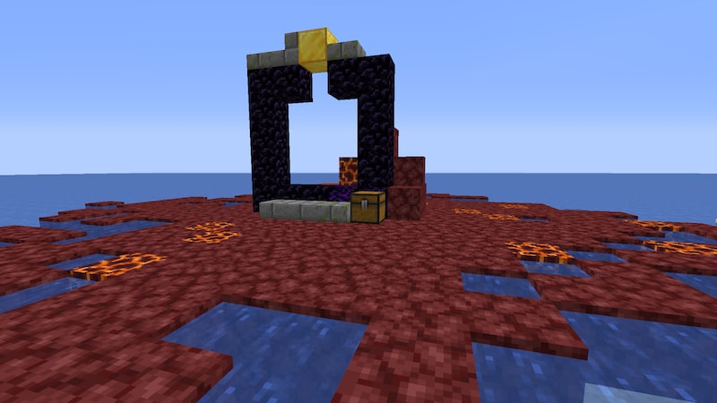 ドラウンド探しの途中で、状態の良いネザーポータル遺跡を発見しました。チェストには大したものは入っていませんでした。泣く黒曜石と金ブロックだけ回収します。
