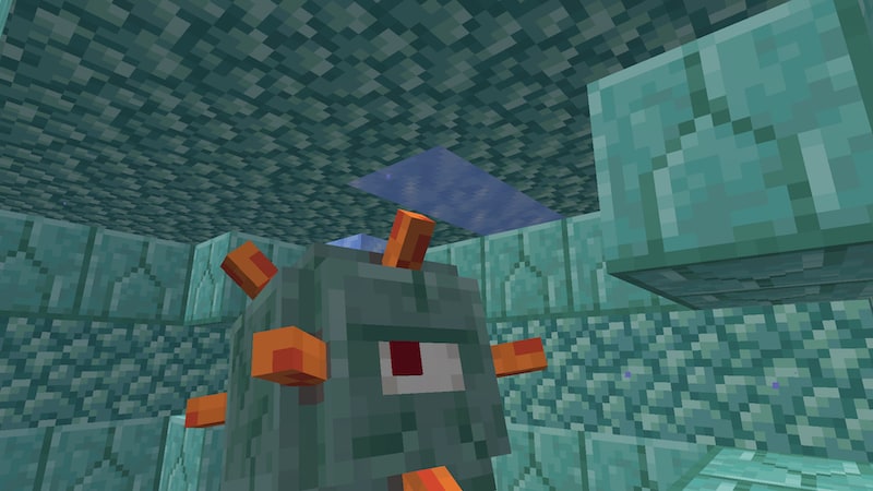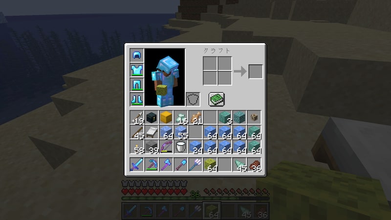 せっかくなのでトライデントを使ってみます。水生特攻5と激流3、耐久力3、修繕つきです。ガーディアンを攻撃してみると、普通に攻撃しても激流で攻撃しても2発で倒せます。ダメージ増加5のダイヤソードだと3発なのでそれよりは強いですが、JAVA版だと攻撃速度が遅いのでなかなか使いづらいです。激流も当たり判定が微妙だし。忠誠3もつけたことがありますが、戻ってくるまでに時間がかかっていたと思うので、癖が強い武器です。