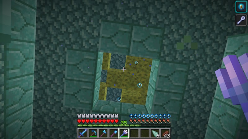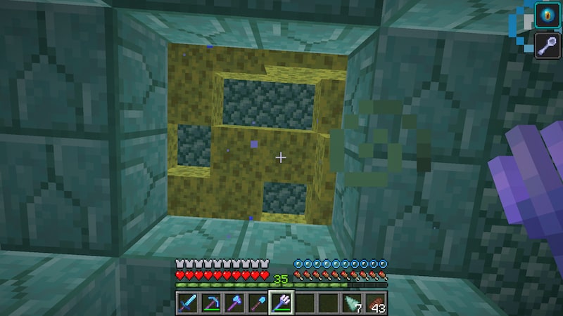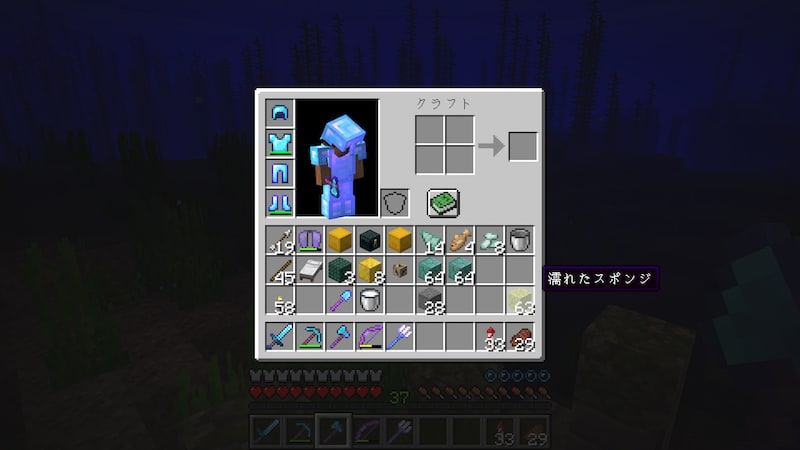このワールドでは3つの海底神殿を攻略していますが、すべての海底神殿でスポンジ部屋が2つありました。何年か前に3つ4つ攻略してもひとつもスポンジ部屋がなかったので、何か変わったのか、それとも今回は運がいいだけ?