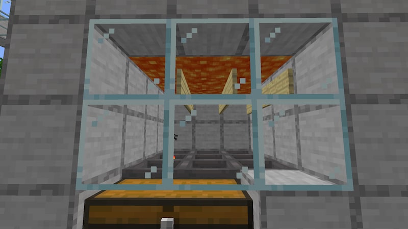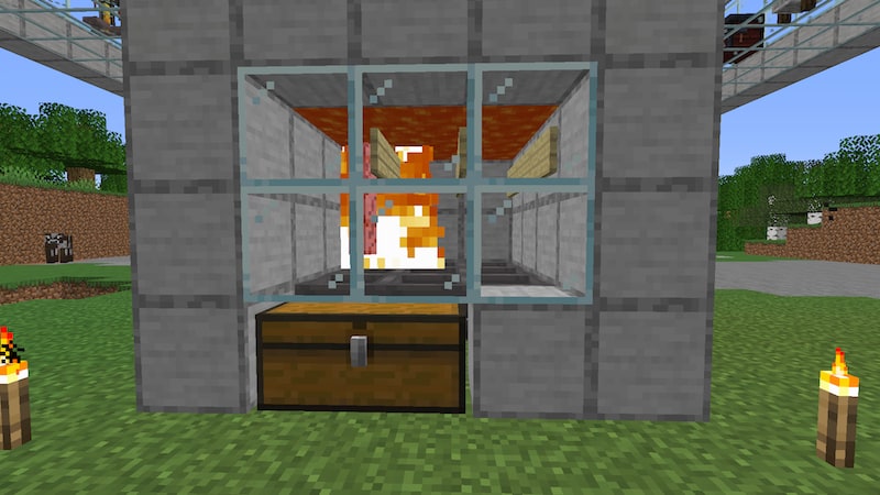処理場です。溶岩でアイテムが燃えたりしないか心配だったのでマグマブロックにすることも検討しましたが、マグマブロックにすると下にホッパー付きトロッコを置いてその下にホッパーを置いて…となるか、水流でアイテムを流して…という感じになり結構面倒なので結局溶岩にしました。
