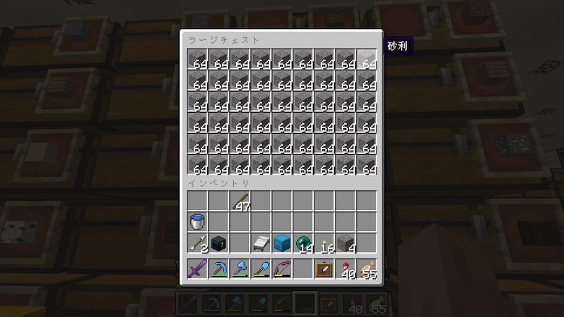次は砂利です。海の底にたくさんあったのでコンジットを設置して回収していましたが、アイテムが海面に浮いていくので結構時間がかかります。砂利を壊して海面でアイテムを回収してを繰り返すので、砂漠で砂を集めるよりも2倍か3倍くらいの時間がかかります。