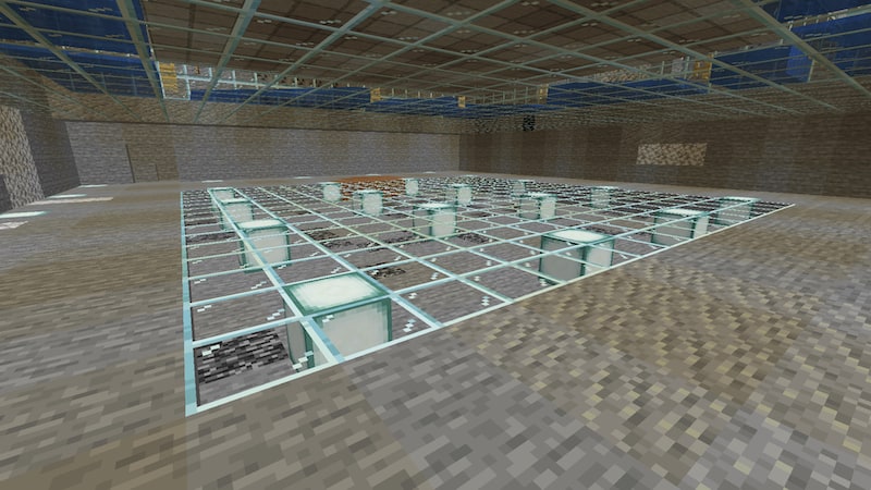 気分転換にスライムトラップの下をホリホリ。ホリホリするとスライムが湧くということを忘れていて、仕方なくガラスを設置。1マスのシーランタンの上って湧くのかな?