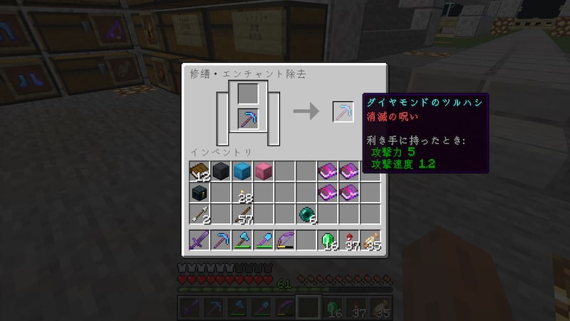 エンドシティで手に入れたダイヤのツルハシですが、消滅の呪いを除去してエンチャントしようとしましたが、消滅の呪いって砥石で除去できないんですね。