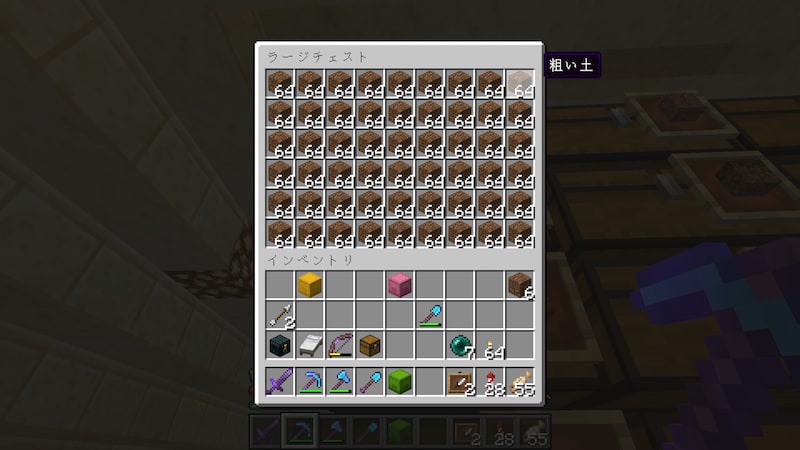次は粗い土です。これは土2つと砂利2つでクラフトすると作れます。一部のバイオームにも自然生成されると思いますが、クラフトしたほうが早いです。