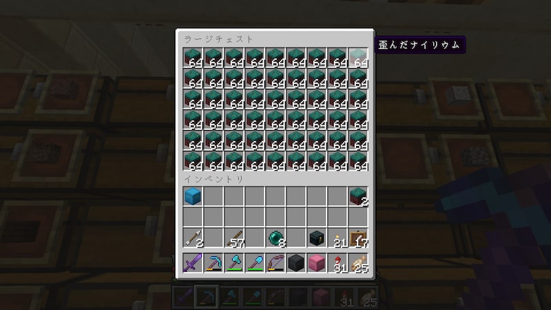 真紅のナイリウムと歪んだナイリウムはネザーで集めました。地面がボコボコしていたり、ホグリンが湧いたり、木が邪魔だったりして、集めるのに地味に時間がかかります。