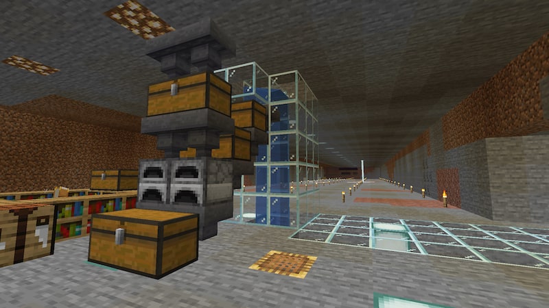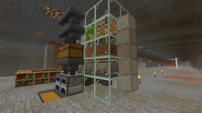 というわけで、サバイバルの世界で実際に作ってみました。上の画像はよく使われるかまど装置です。後ろの水が通っているところの下から竹が上がってきて、燃料として供給されます。精錬するものは地上からでも入れられるようになっていますが、精錬したものを地上に送る装置を作るかどうかはまだ決めかねています。