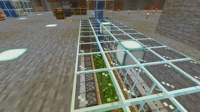 クリエイティブで一度作ってみると、竹の上にアイテム化した竹が乗ってしまい、下のホッパーつきトロッコで回収できなかったので、水を流して地面に落とせないか実験してみました。