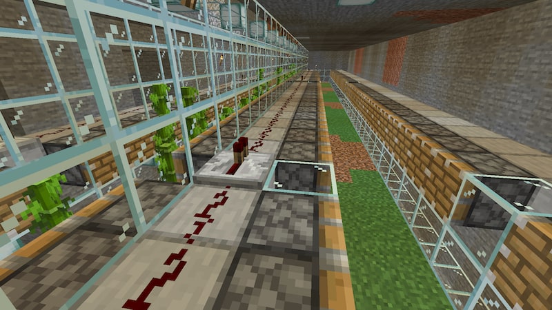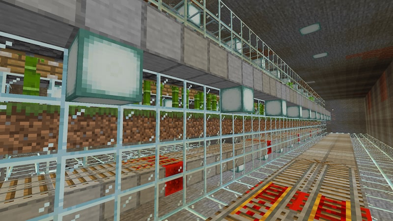 今回は前々回に作った、竹を使った全自動燃料供給装置を拡張していきます。私の計算によると、かまど一個あたり82本の竹を植えれば、かまどで精錬し続けても燃料供給が追いつきます。ただ、竹の成長スピードは完全に一定ではないので、余裕を持って100本にしようと思います。かまどは2つ設置しているので、合計で200本の竹を植えることになります。