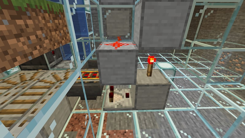 中央のレッドストーン回路は、コスト削減と省スペース化を兼ねて左右で共有しています。リピーターのところだけピストンを置かずに間が空くのが気持ち悪かったので試行錯誤してみましたが、結局この形になりました。