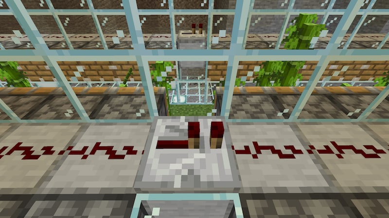 ピストンを動作させるためにレッドストーンダストを置いていきますが、信号は15マスしか届かないのでリピーターを挟むことになります。ただ、リピーターの下のブロックには動力が伝わらないので、上の画像のようにリピーターのところにはピストンを置かずに、竹も植えていません。