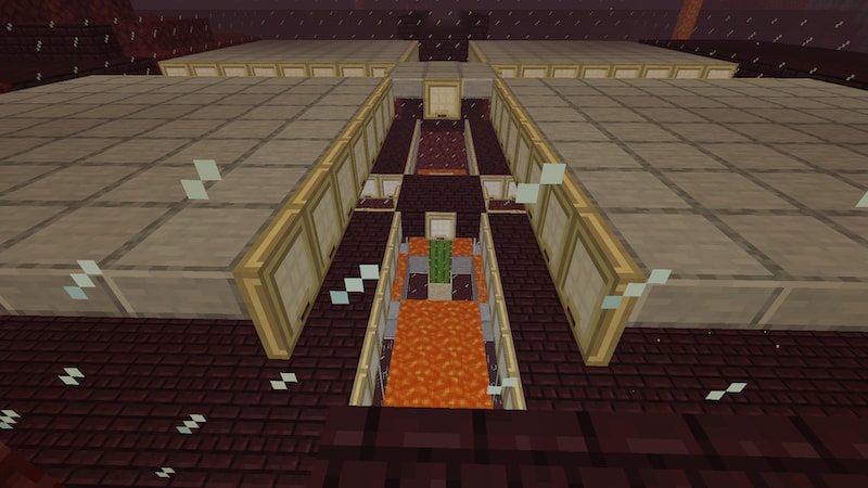 初めはオーバーワールドで作ったトラップタワーの水を溶岩に変えただけのものを作ろうとしましたが、クリエイティブで試してみると、溶岩流でMobが流される速度が遅すぎてダメかも知れないと思ったので、湧き層はトラップドアにして一番下だけ溶岩流で集める形にしました。
