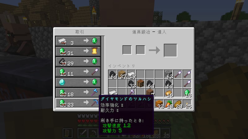 とりあえず村人の職業は、エメラルド回収用の農民とダイヤツールを交換してくれる道具鍛冶、ダイヤソードをくれる武器鍛冶、ダイヤ防具をくれる防具鍛冶になってもらいました。