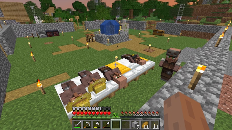 村が大きいため、全体を囲ったり湧き潰ししたりするのは大変なので、丸石で20×20くらいのスペースを作り、そこにベッドと職業ブロックを置いて生活してもらいます。