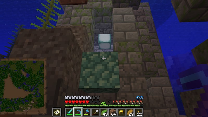 海で遺跡を発見。海底神殿のブロックやマグマブロックがあったので回収しておきました。また、チェストに宝の地図もあったので宝探しに。そして宝箱から海洋の心を発見しました。ラッキー!