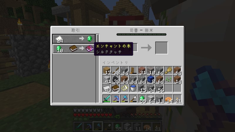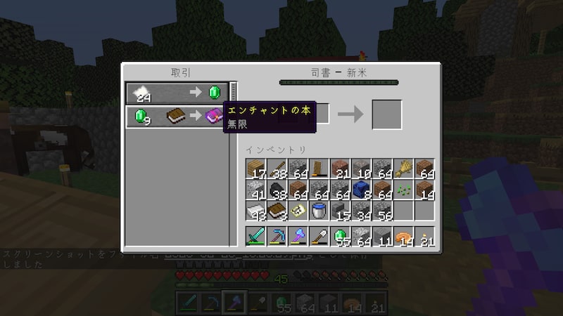 建設途中で作物が結構育ったので、一度村に行きエメラルドと交換に。ついでに司書を増やしてエンチャント本も確保。