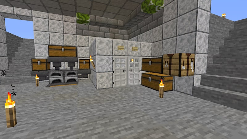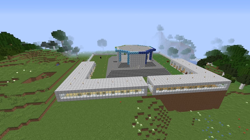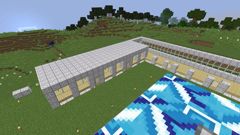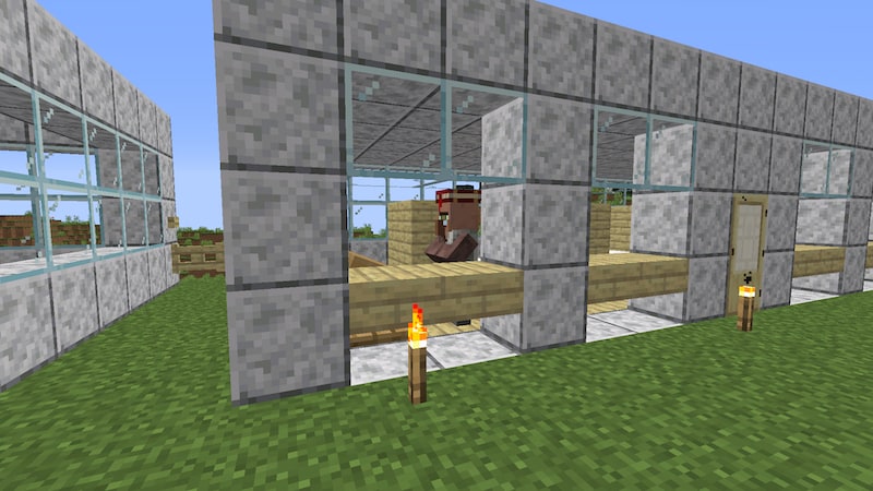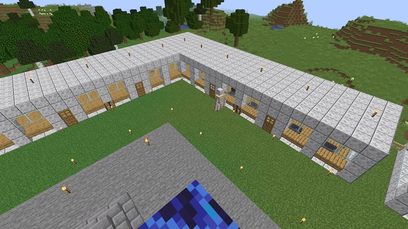 いろいろと悩んだ末、村人の住居と拠点周りの壁を一体型にすることにしました。ブロックもいろいろ検討しましたが、結局磨かれた閃緑岩にしました。