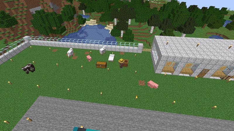 動物たちも連れてきました。農民の方の家はまだ作っていませんが、エメラルドが欲しいのでとりあえず空き地にコンポスターを設置。