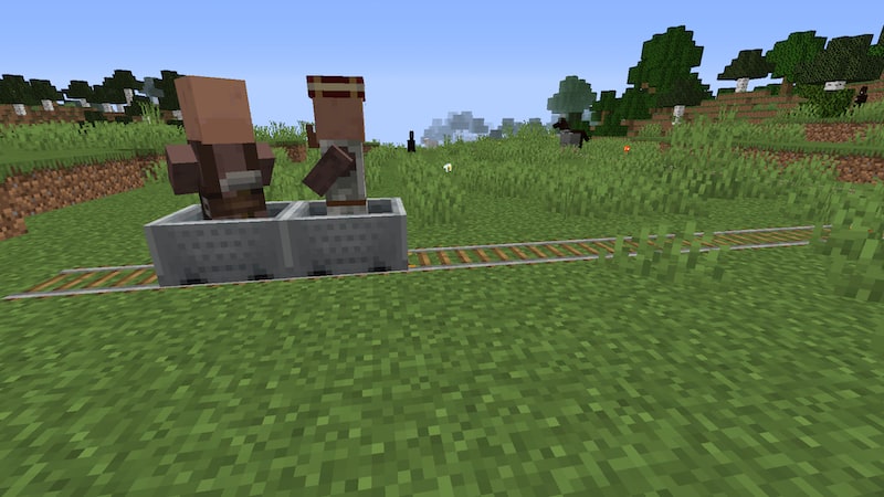 村と拠点は500マスくらい離れているので、連れてくるのも一苦労。統合版だと船にリードをつけて簡単に連れてくることができますが、JAVA版ではできないのでトロッコ移動。マイクラ時間で3日くらいかかった。
