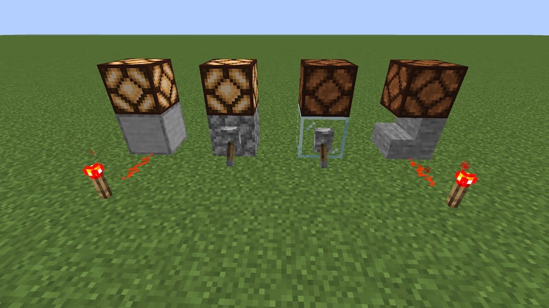 基本的に1×1×1マスの当たり判定のないブロックには動力部品(立方体のものを除く)や伝達部品の設置ができませんが、上付きハーフブロックの上面や下付きハーフブロックの下面、階段ブロックの1×1マスになっている面には設置できます。また、フェンスや塀、ガラス板、鉄格子、鎖、閉じているフェンスゲート、などの上にレッドストーントーチを設置できます。