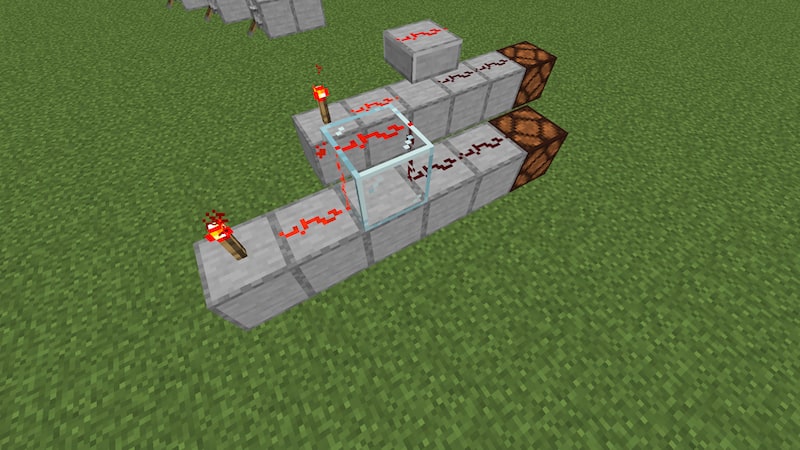 上下1マスの段差になっている接続部に不透過ブロックを置くと回路は切断されますが、ガラスやハーフブロックなどの透過ブロックを置いても切断されません。