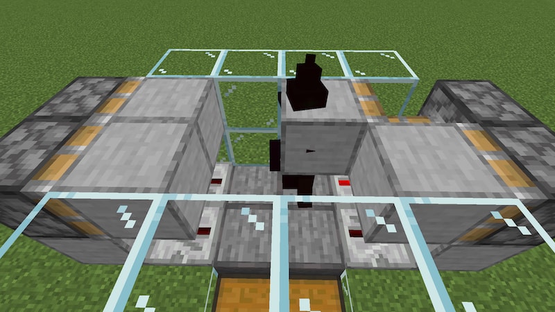 上の画像は、3×3の範囲からピストンを使ってMobを1マスに集める装置です。最初から水流で1マスに集めたほうが楽かも…。